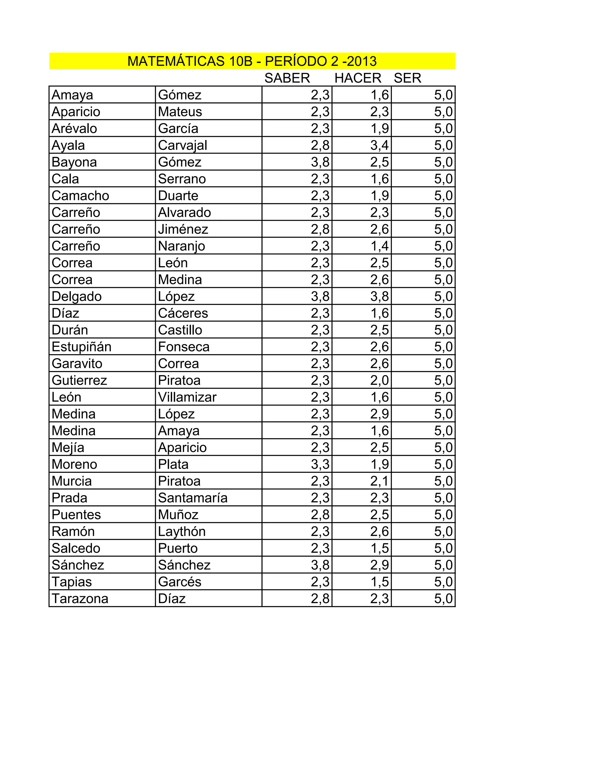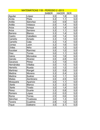 Le document contient des résultats académiques de divers étudiants en mathématiques et en physique pour le deuxième période de l'année 2013. Chaque entrée inclut des notes pour différents élèves et des évaluations dans plusieurs matières scolaires. Les données montrent une variété de performances académiques parmi les étudiants.