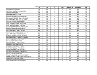 Le document présente les résultats d'une évaluation de performances académiques de plusieurs étudiants, illustrés par des notes sur différents exercices. Chaque ligne contient le nom de l'étudiant, suivi de ses notes dans diverses matières. Les notes varient entre 0 et 5, avec des moyennes signalées pour chaque élève.