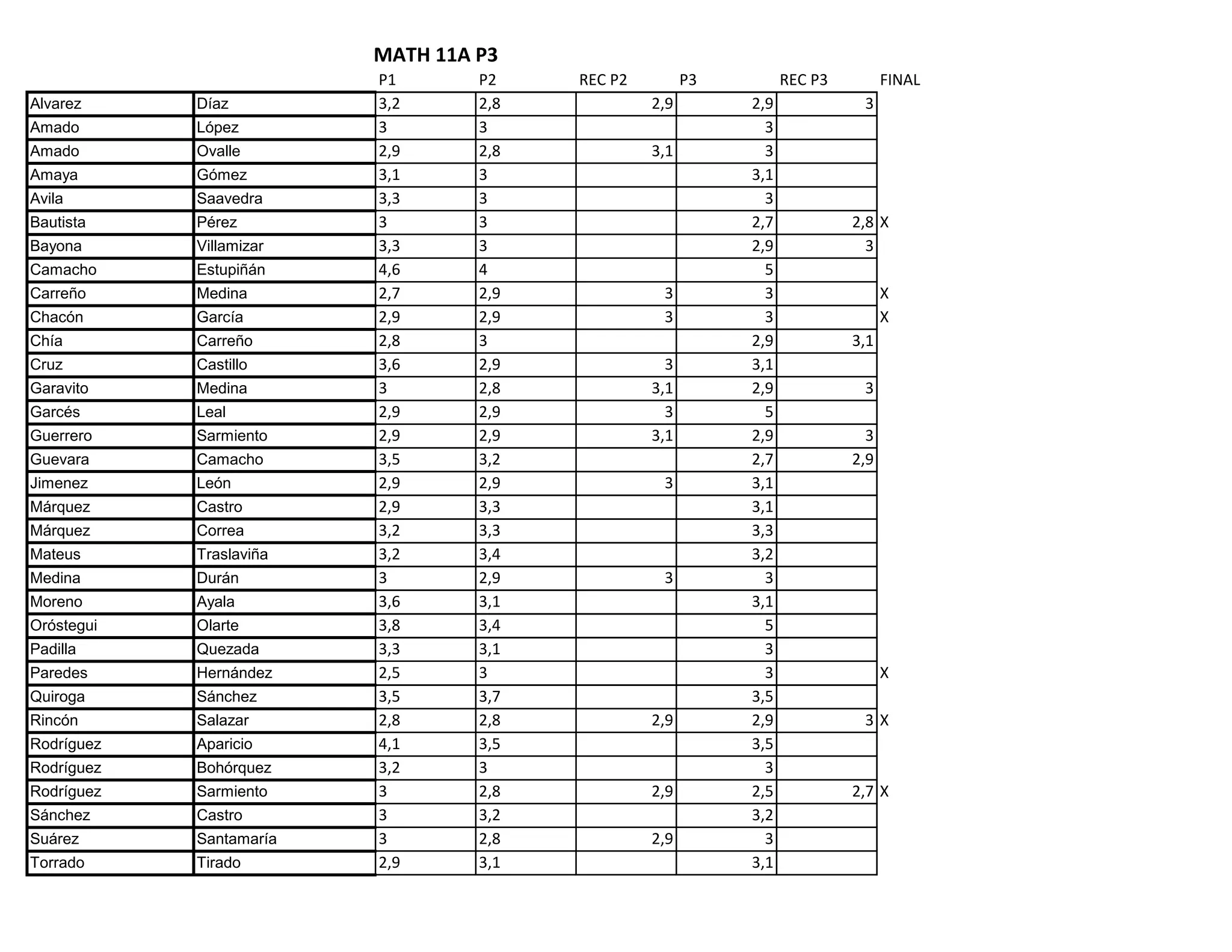 Le document présente les résultats académiques d'une classe de mathématiques, avec des notes réparties sur plusieurs périodes d'évaluation. Il comprend des données pour les élèves de math 11a et 11b, incluant des notes par évaluation et des moyennes finales. Les résultats montrent des variations dans les performances des élèves à travers les différentes périodes.