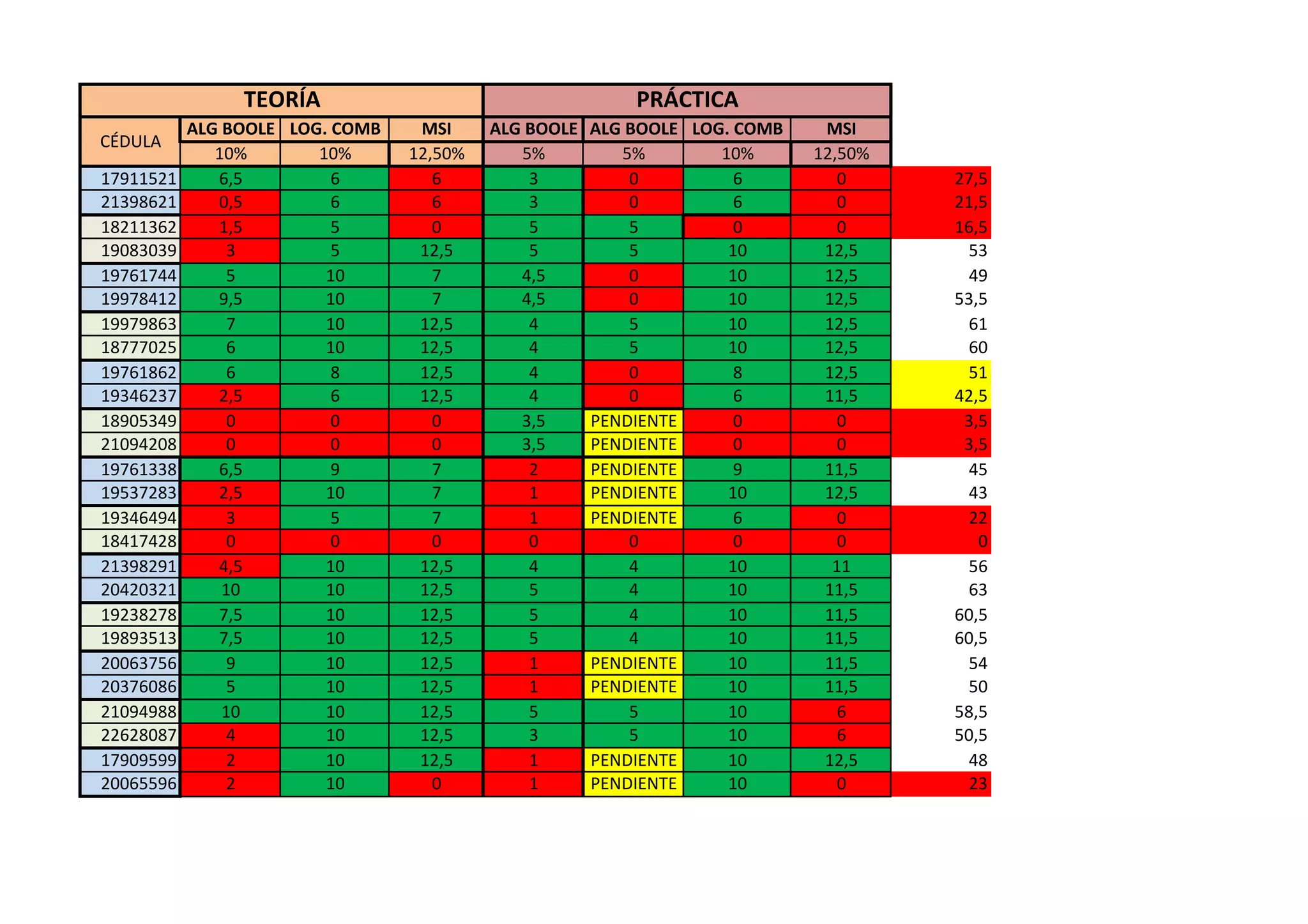 Le document présente des résultats d'évaluation d'étudiants sur divers algorithmes et logiques booléennes. Chaque ligne montre des cédules avec des pourcentages de performance variant entre 0% et 12,5%, accompagnés de notes et de statuts de présence. Plusieurs étudiants ont des résultats en attente, indiquant des évaluations non finalisées.