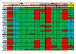 El documento presenta una tabla con datos relacionados a la evaluación de estudiantes en asignaturas de álgebra booleana, lógica combinacional y lógica secuencial, con calificaciones y acumulados porcentuales. Se enumeran identificadores de estudiante y sus respectivas puntuaciones en diversas evaluaciones. La información refleja el rendimiento académico en diferentes componentes de un curso técnico.