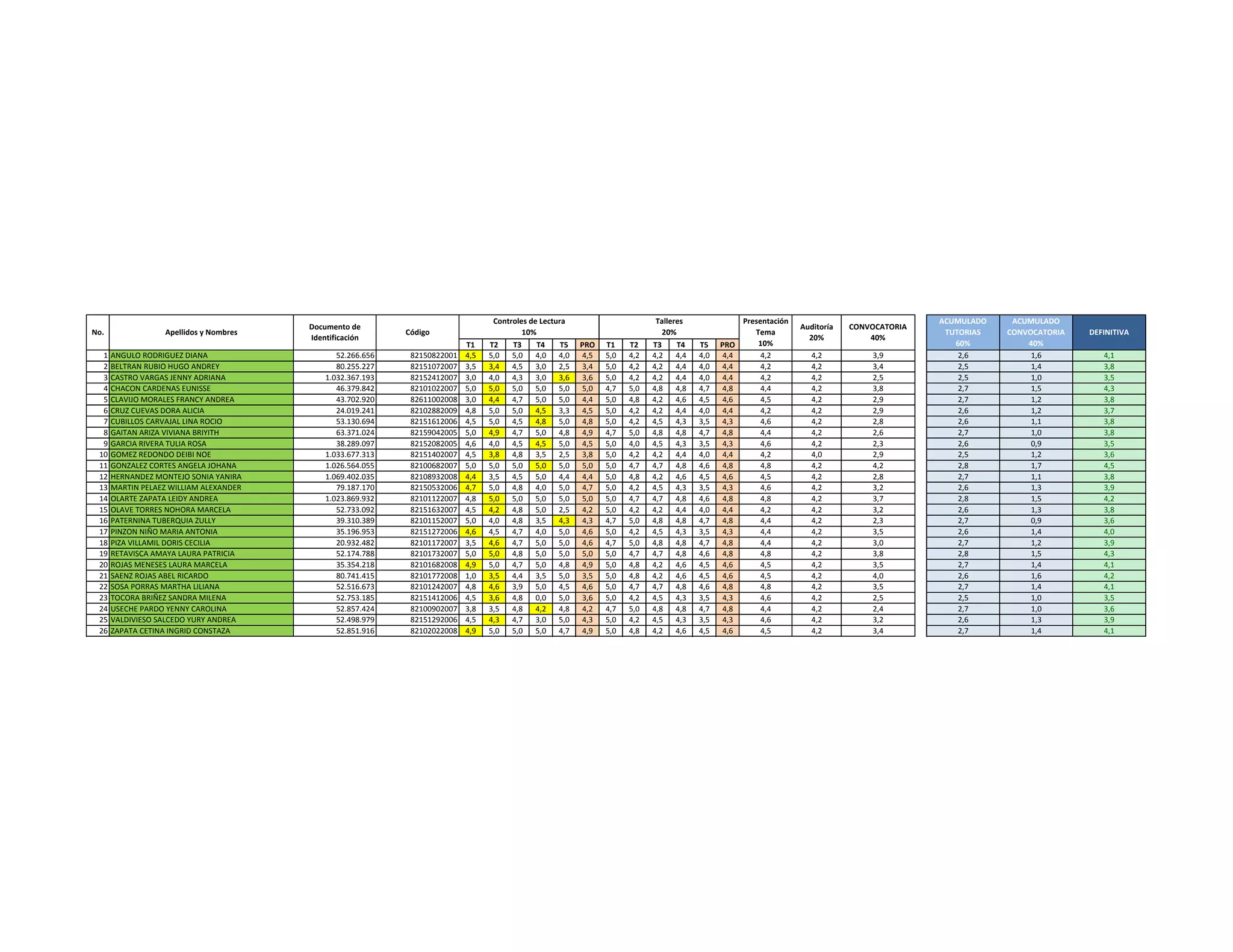 Le document présente un tableau de performance d'étudiants, incluant leurs noms, identifications et notes dans différents contrôles et tutoriels. Les notes sont classées en plusieurs colonnes, chacune représentant un moment ou un aspect de l'évaluation. Ce rapport permet de visualiser les performances individuelles dans le cadre d'un audit académique.