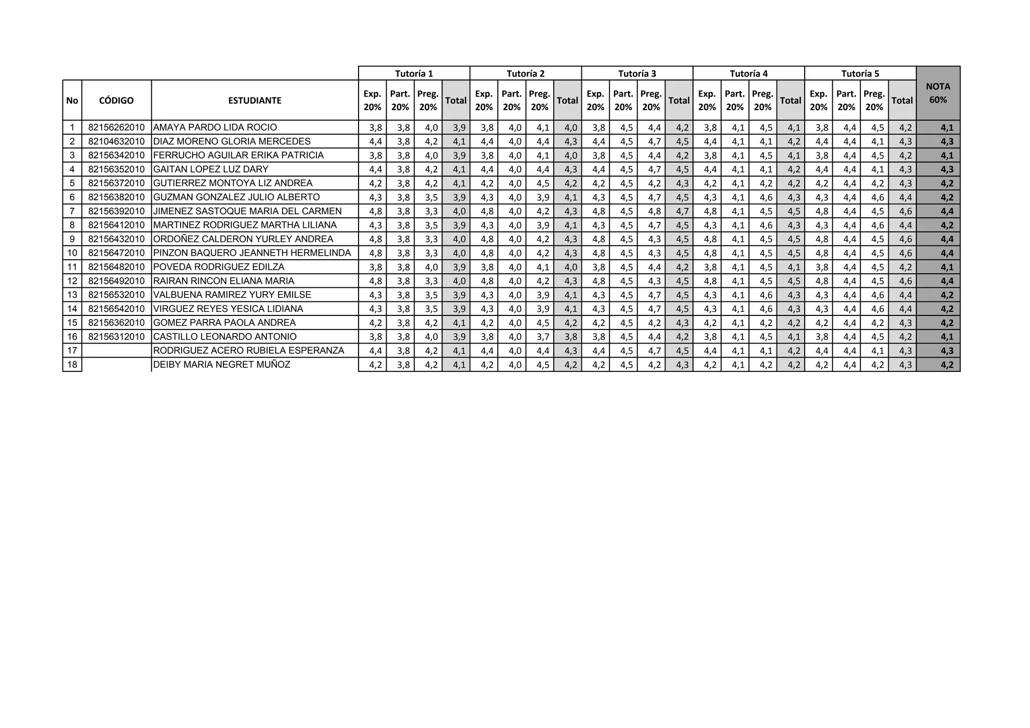 Le document présente les notes d'étudiants pour plusieurs tutorats, en détaillant les performances individuelles par étudiant. Chaque étudiant est identifié par un code et leurs notes sont listées par tutorat, avec un total basé sur les pourcentages alloués aux différentes évaluations. Les données incluses montrent une gamme de performances, indiquant les résultats académiques des étudiants dans différents modules.