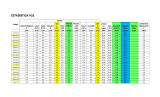 Le document présente des données statistiques sur les résultats d'étudiants dans divers ateliers, quiz et examens. Chaque section indique des notes individuelles ainsi que les pourcentages associés aux différentes évaluations. Les résultats montrent une variabilité significative dans les performances des étudiants à travers les différentes évaluations.