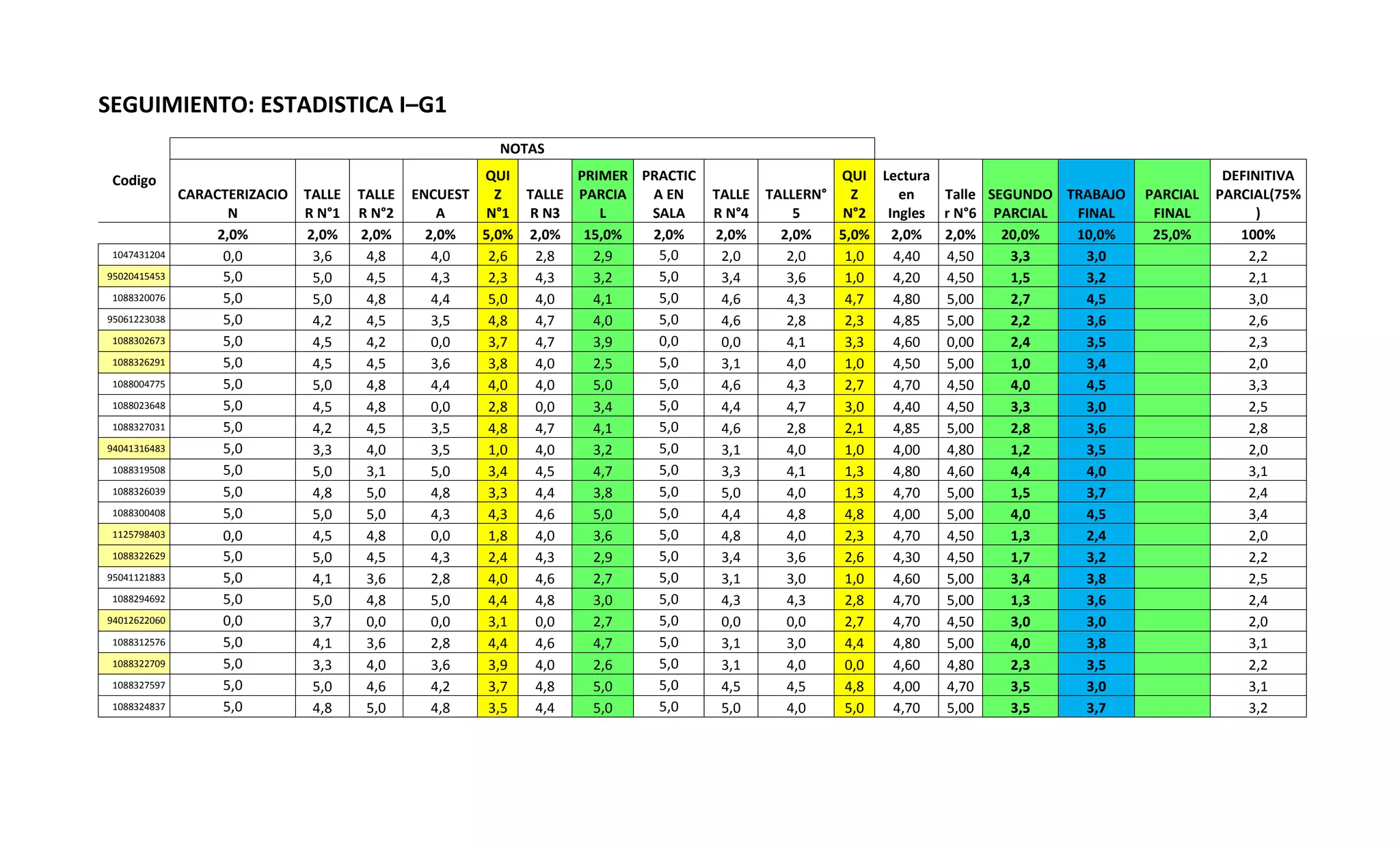 Le document présente des statistiques sur les performances académiques dans différents ateliers, classes et évaluations. Il inclut des notes pour plusieurs étudiants, chacune attribuée à divers travaux et examens. Les résultats sont soumis à un système de pondération pour calculer les notes finales.