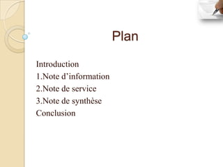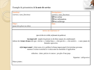 Le document présente les différents types de notes utilisées dans le cadre professionnel, notamment la note d'information, la note de service et la note de synthèse. Chacune de ces notes a des objectifs spécifiques, des règles de rédaction et des caractéristiques qui garantissent une communication claire et efficace. La note de synthèse, en particulier, est un outil essentiel qui exige une analyse fidèle des documents tout en maintenant une objectivité et en respectant des règles de forme et de fond.