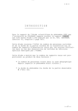 Ce document étudie la relation entre le nombre de rapports d'observation d'OVNI et divers facteurs, notamment la population et la durée des observations. Il en conclut que le nombre de rapports est proportionnel à la densité de population et à la durée d'observation, renforçant l'idée que les observations sont réelles. L'étude souligne également l'impact des conditions météorologiques sur la visibilité et le nombre de rapports reçus.