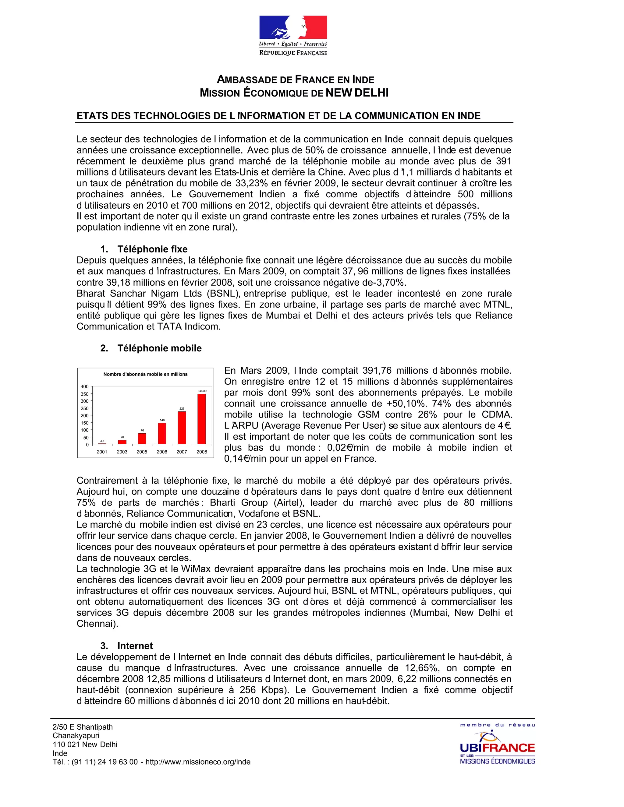 Le secteur des technologies de l'information et de la communication en Inde connaît une croissance exceptionnelle, devenant le deuxième plus grand marché de la téléphonie mobile au monde avec 391 millions d'utilisateurs. La téléphonie mobile, notamment, a enregistré une augmentation annuelle de 50%, tandis que le marché de l'internet est en développement, avec des ambitions pour atteindre 60 millions d'abonnés d'ici 2010. Parallèlement, les services informatiques génèrent une croissance annuelle de 33%, représentant 5,5% du PIB indien et créent de nombreux emplois.