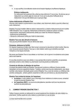 Ebastine Teva est un antihistaminique utilisé pour soulager les symptômes d'allergies, notamment la rhinite et l'urticaire. Il ne doit pas être utilisé chez les personnes allergiques à ses composants, et des précautions sont nécessaires pour ceux ayant des problèmes cardiaques ou hépatiques. Les effets indésirables possibles incluent somnolence, sécheresse de la bouche et autres, et il est important de consulter un médecin en cas d'effets indésirables.