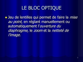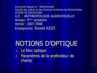 Le document traite des notions d'optique appliquées à la vidéo, telles que le bloc optique, le diaphragme, le zoom, et la netteté. Il explique comment différents paramètres influencent la profondeur de champ et comment les réglages de distance, d'ouverture et de focale peuvent être manipulés pour obtenir des images nettes. Des modes automatiques sur les caméscopes sont également évoqués pour diverses situations de prise de vue.