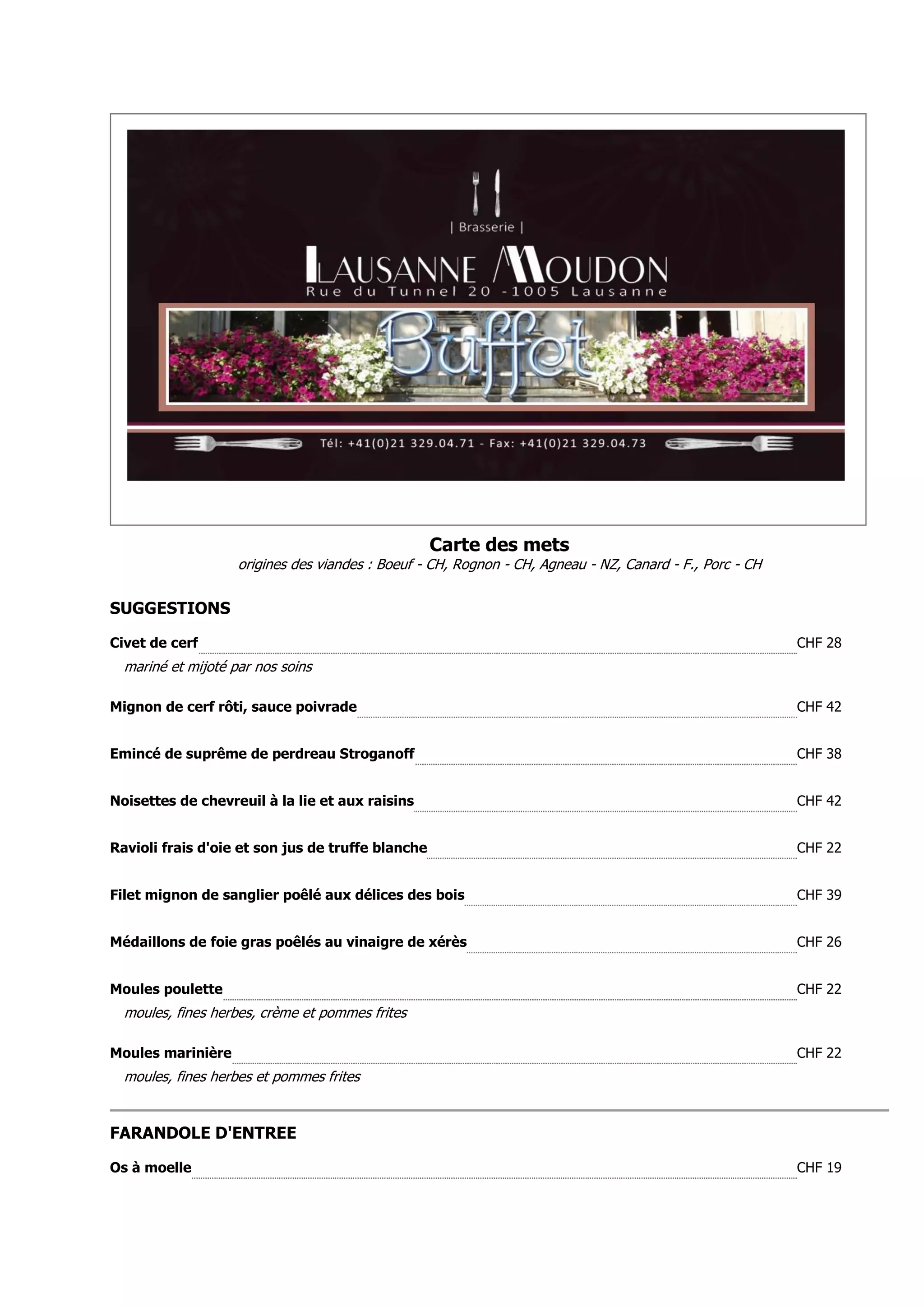 Le document présente une carte des mets comprenant des plats variés à base de viandes comme le boeuf, l'agneau et le canard, avec les prix correspondants. Il propose également une sélection de plats végétariens ainsi qu'une gamme de desserts et glaces artisanales. Chaque plat est détaillé avec des ingrédients spécifiques et des prix en CHF.