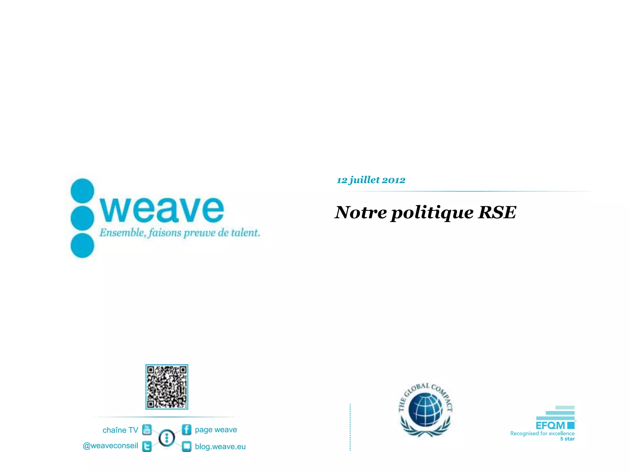 Le document présente la politique de développement durable de Weave, intégrant des engagements sociaux, environnementaux et économiques basés sur le Pacte mondial des Nations Unies. Weave met en œuvre des actions concrètes pour promouvoir l'équilibre entre vie professionnelle et vie privée de ses collaborateurs tout en renforçant sa responsabilité sociétale à travers divers projets humanitaires et environnementaux. La société s'engage également à optimiser ses pratiques internes et à encourager la diversité dans ses processus de recrutement.