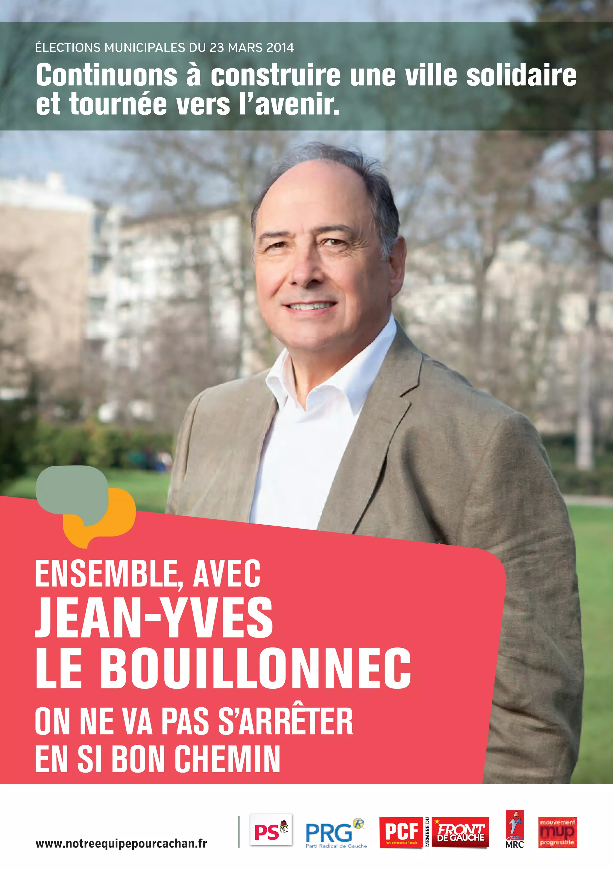 Le document présente le bilan et le programme de Jean-Yves Le Bouillonnec pour les élections municipales de Cachan en 2014, axé sur le développement d'une ville solidaire et tournée vers l'avenir. Il souligne l'engagement de l'équipe municipale pour améliorer le cadre de vie, la solidarité, l'éducation et les services publics, tout en maintenant les impôts locaux inchangés. Les projets incluent la création de logements intergénérationnels, l'amélioration des équipements publics et le soutien à la diversité sociale et commerciale.