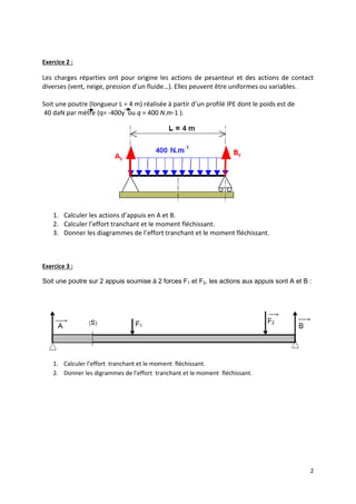 Le document décrit une série d'exercices sur la résistance des matériaux, incluant des calculs sur un poteau soumis à compression et une poutre sous diverses charges. Les exercices portent sur le flamber, les actions d'appui, ainsi que les efforts tranchants et moments fléchissants. Des propriétés matérielles comme l'acier E240 et différents moments d'inertie sont également précisés.