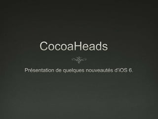 La présentation CocoaHeads couvre les nouveautés d'iOS 6, mettant en avant l'intégration de UIRefreshControl pour le rafraîchissement natif et la UICollectionView pour une gestion avancée des cellules et des vues supplémentaires. Le document explique le fonctionnement et les différentes propriétés des composants, ainsi que la flexibilité offerte dans la mise en page. Des démos illustrent comment ces nouveautés améliorent l'interaction utilisateur et la personnalisation des designs.
