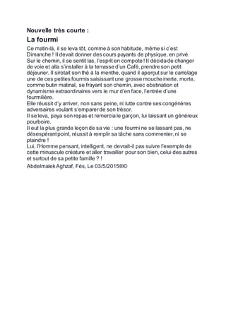 Une homme se rend au café pour un petit déjeuner au lieu de donner ses cours de physique, se sentant las et à l'esprit en compote. Il observe une fourmi qui lutte pour transporter une mouche vers sa fourmilière, ce qui lui inspire une importante leçon de persévérance. Cela lui rappelle qu'il doit se battre pour son travail et sa famille, tout comme la fourmi.