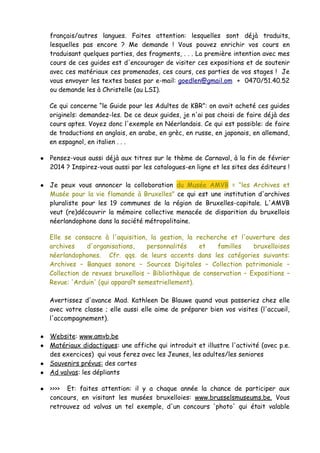 Le document présente des ressources et des activités pédagogiques pour les professeurs de français, y compris une exposition sur les bénévoles à Bruxelles et des poèmes à intégrer dans les cours. Il souligne l'importance de traduire des guides et d'encourager les visites d'expositions pour enrichir l'apprentissage des élèves. De plus, il évoque des initiatives culturelles et sportives, ainsi que des opportunités de bourses pour les jeunes.