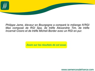 L'essai comparatif entre le mélange n’rgi max et un rgi en pur a montré que n’rgi max offre un meilleur rendement de 6,1 tonnes de matière sèche par hectare contre 4,1 tonnes pour le rgi pur. Le mélange, qui inclut des variétés de trèfle et de ray-grass d'Italie, présente également une amélioration significative de la qualité alimentaire, avec une augmentation de 11% en énergie et un meilleur taux de protéines. Économiquement, n’rgi max se révèle plus avantageux avec un coût de production réduit et moins de besoins en fertilisation.