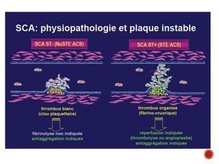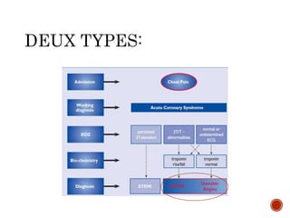 Le document traite des syndromes coronaires aigus sans sus-décalage ST, abordant la présentation clinique, l'interrogatoire et les facteurs de risque associés à la douleur thoracique. Il discute également des méthodes de diagnostic, des examens complémentaires nécessaires et des stratégies thérapeutiques pour assurer la perméabilité artérielle. Enfin, il souligne l'importance de la gestion à long terme et du contrôle des facteurs de risque post-diagnostic.