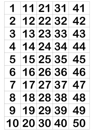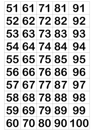 Le document présente une séquence numérique continue, allant de 1 à 100, répartie en plusieurs lignes. Chaque ligne contient 10 nombres, organisés de manière ascendante. Cette structure structurant les nombres semble être une simple enumeration sans contexte supplémentaire.