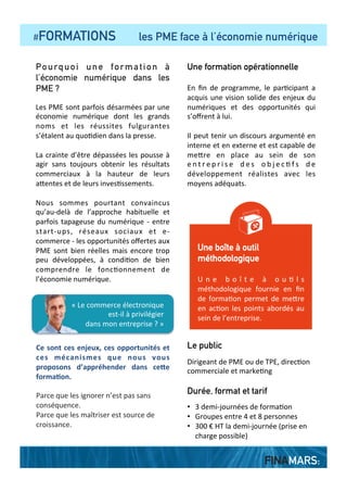 Finamars propose une formation dédiée aux PME pour les aider à comprendre et tirer parti de l'économie numérique. Le programme aborde les enjeux réels du numérique, les opportunités pour les PME et inclut des outils méthodologiques pour leur application dans l'entreprise. La formation est destinée aux dirigeants et se déroule sur trois demi-journées.
