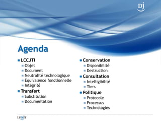 Le document traite des considérations juridiques liées à la numérisation et à la substitution de documents, soulignant la nécessité d'assurer l'intégrité et la valeur juridique des documents quel que soit leur support. Il stipule que les documents électroniques et ceux sur papier ont une valeur juridique équivalente tant que leur intégrité est maintenue, et précise les procédures de transfert et de destruction des documents. Enfin, il aborde la conservation, la disponibilité et l'accessibilité des documents tout au long de leur cycle de vie.
