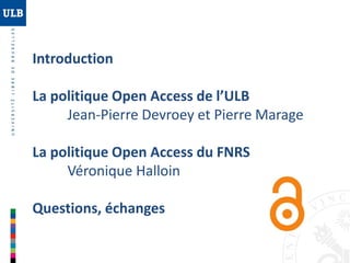 Le document présente la politique open access de l'Université libre de Bruxelles (ULB) et du Fonds national de la recherche scientifique (FNRS), soulignant l'importance de rendre la recherche financée par des fonds publics accessible au public. Il aborde les voies vertes et dorées du libre accès, ainsi que les objectifs de visibilité et d'archivage des travaux scientifiques à l'ULB. Des informations sur les politiques des éditeurs et les ressources d'accompagnement pour les chercheurs sont également fournies.