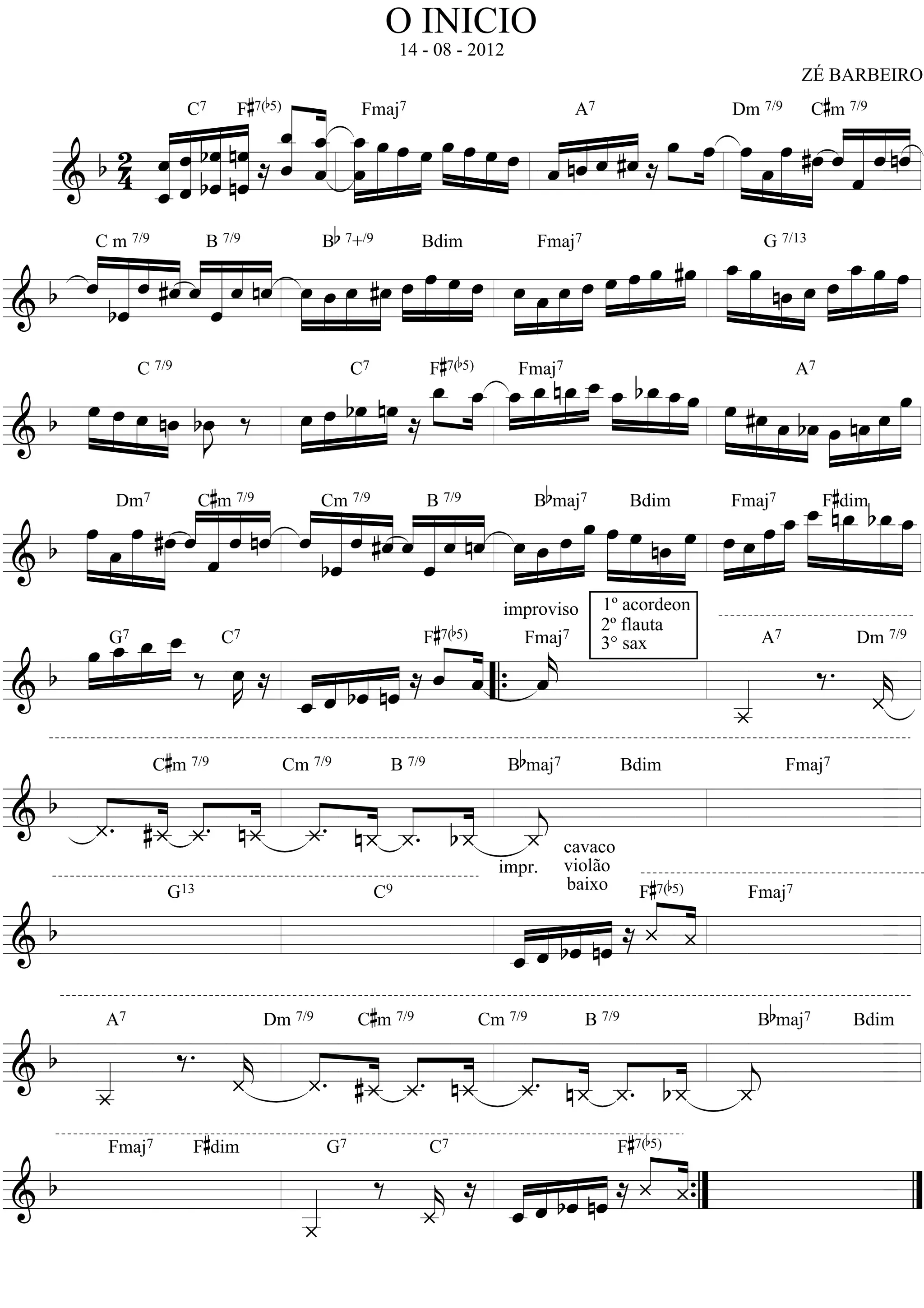 Le document semble être une partition musicale complexe contenant des accords, des notations et des instructions pour divers instruments tels que l'accordéon, la flûte et la guitare. Les symboles et les notations indiquent des improvisations et des variations sur des accords. Il inclut également des sections organisées avec des séparateurs indiquant différents passages ou sections de musique.