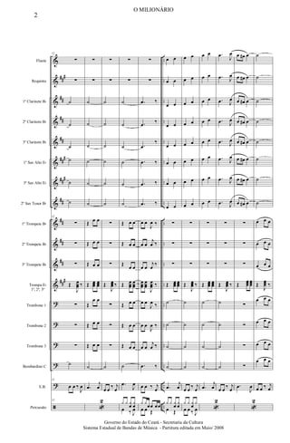 Le document est une partition musicale intitulée 'O Milionário', publiée par la Secretaria da Cultura de l'État du Ceará en mai 2008. Il contient des indications pour divers instruments de musique, notamment des clarinettes, des saxophones, des trompettes et des percussions. La partition est organisée en plusieurs sections et notations spécifiques au format musical.