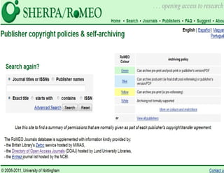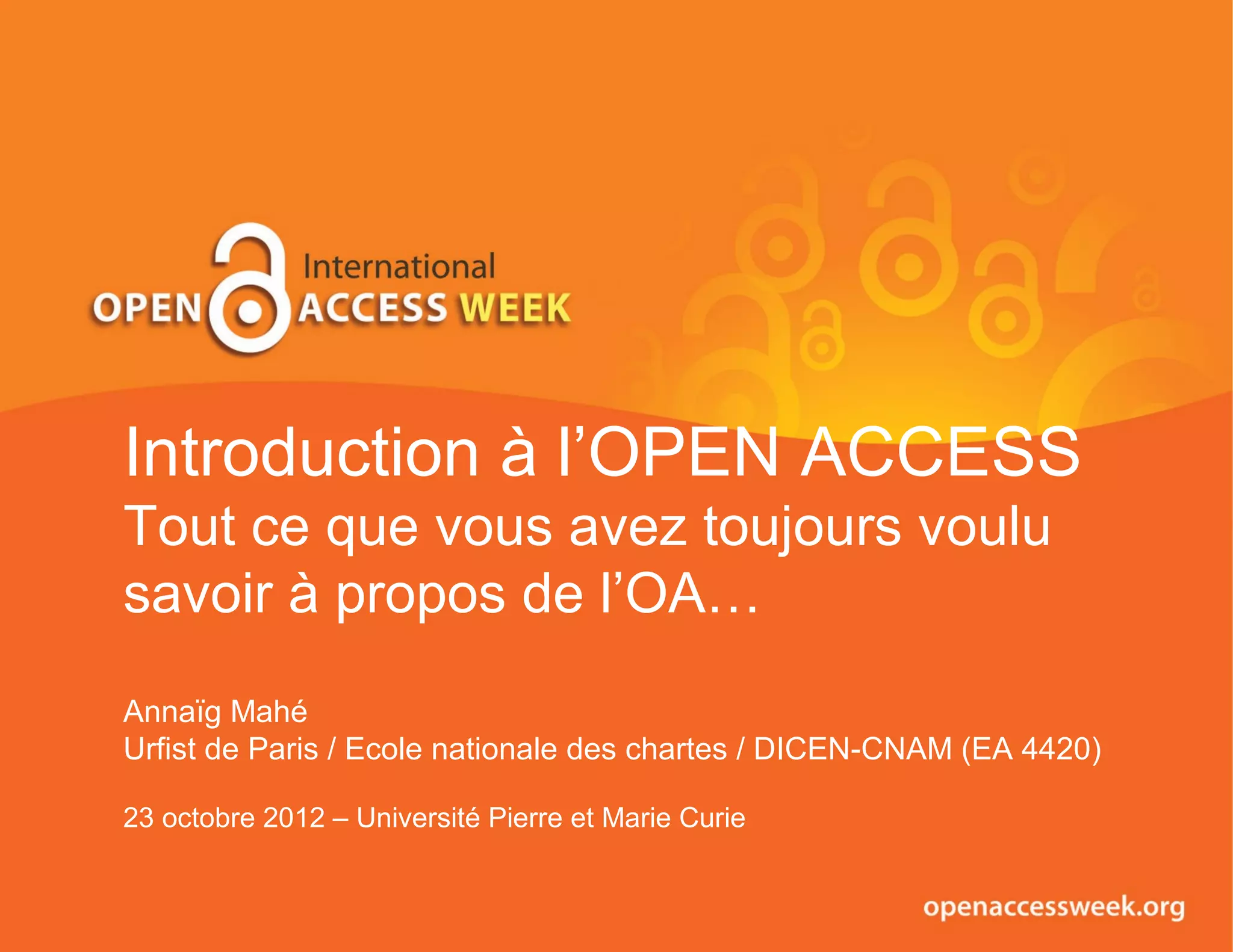 Le document présente une introduction à l'open access, défini par l'initiative Budapest de 2002, qui prône l'accès libre à la littérature de recherche validée par des pairs sur Internet. Deux stratégies sont mises en avant : la voie verte, qui concerne les archives ouvertes avec des dépôts libres, et la voie dorée, qui se réfère aux revues en libre accès avec des modèles économiques variés. Il aborde également des aspects techniques liés à la visibilité, au droit d'auteur et à l'importance de la négociation de contrats de cession des droits pour les auteurs.