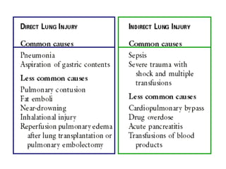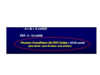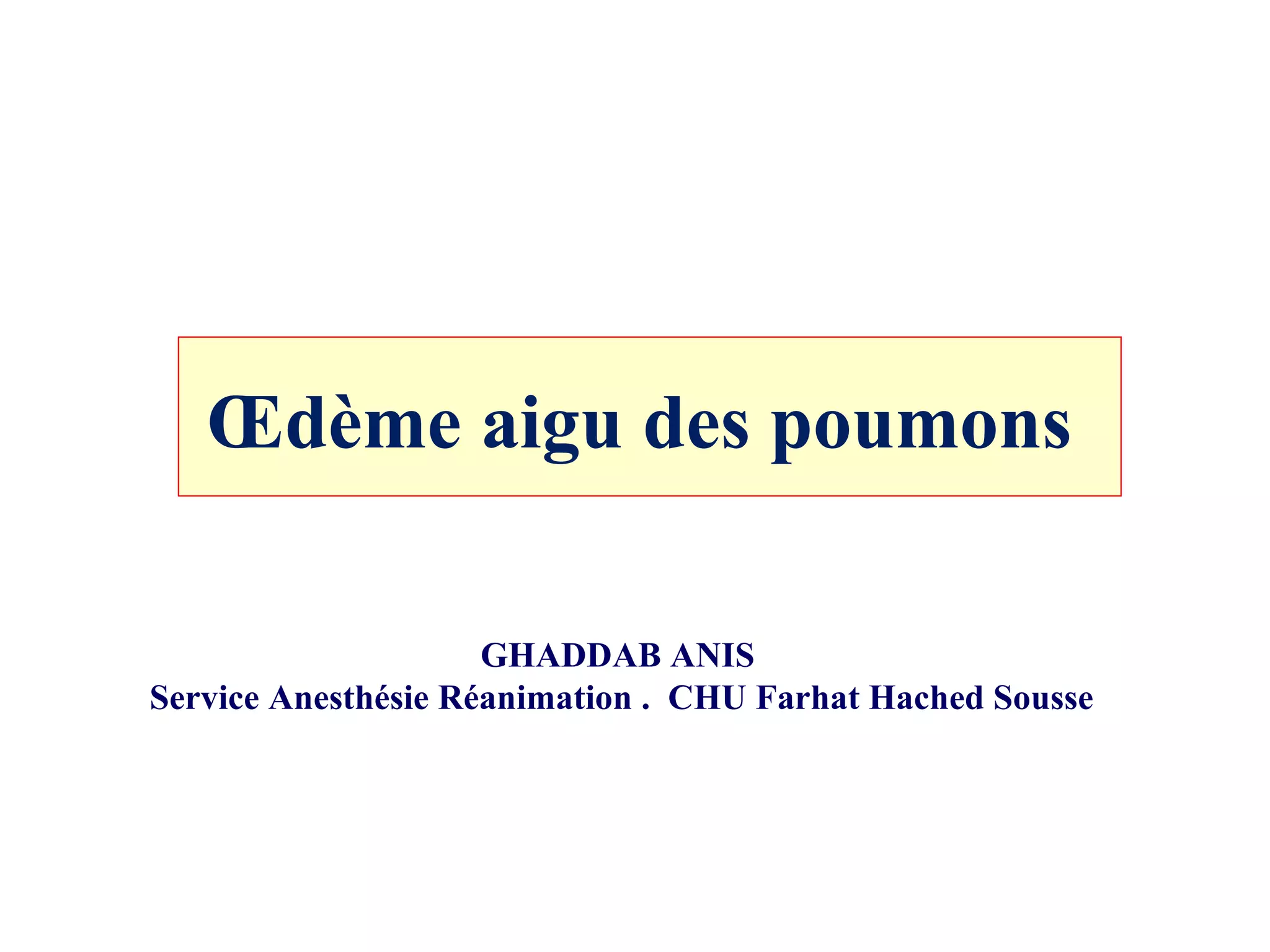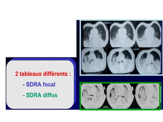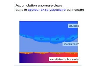 Le document traite de l'œdème aigu des poumons, mettant en évidence ses mécanismes physiopathologiques, notamment l'insuffisance ventriculaire gauche et le syndrome de détresse respiratoire aiguë (SDRA). Il décrit les signes cliniques, les méthodes de diagnostic et les traitements, notamment l'oxygénothérapie, les diurétiques et les inotropes. Les différentes phases du SDRA et leurs implications dans la gestion des patients sont également abordées, avec des recommandations pour une ventilation mécanique protectrice.