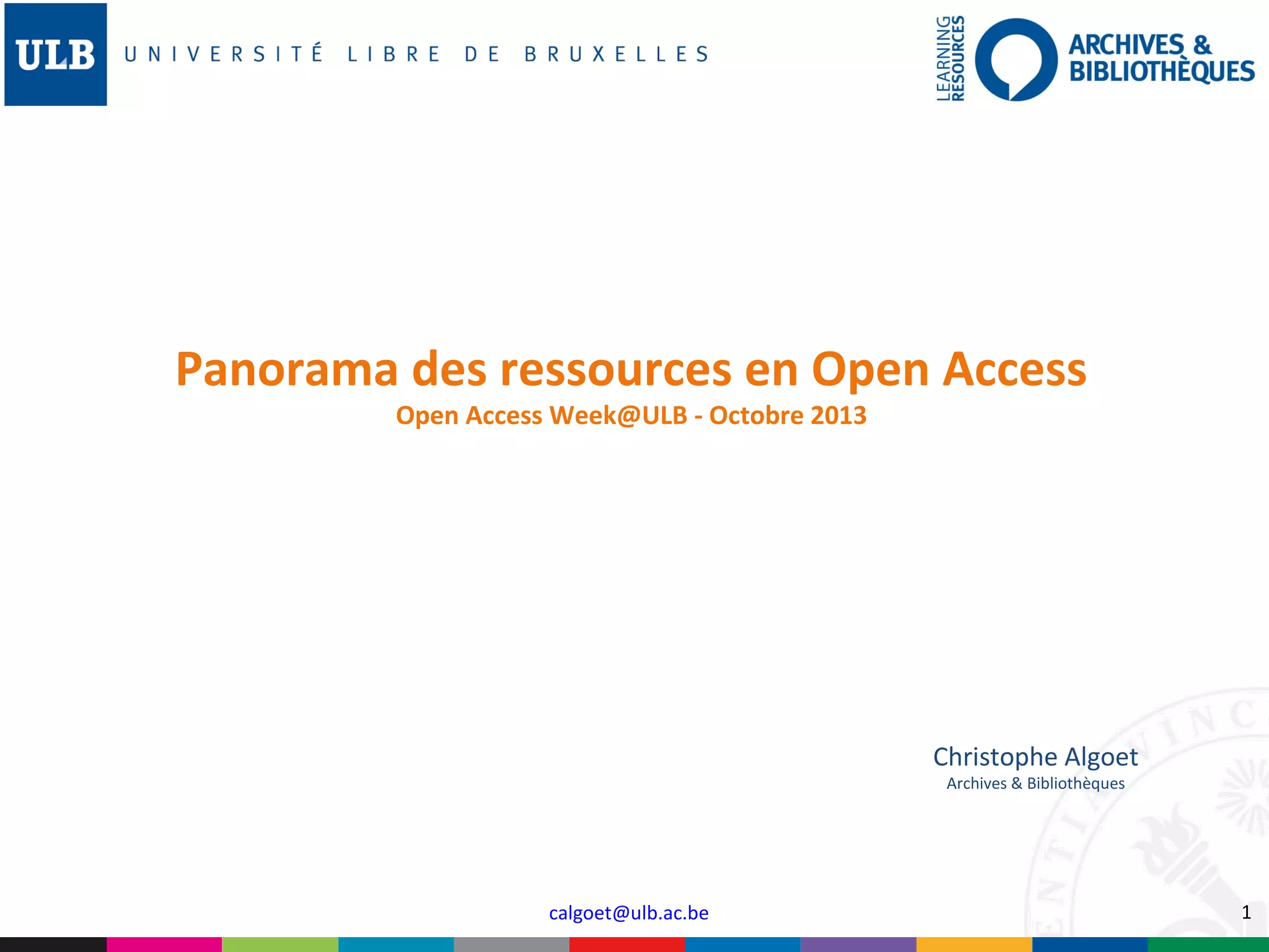 Le document présente un panorama des ressources en open access, abordant la définition, les voies de diffusion, et l'évolution politique en faveur de l'accès libre à la recherche. Il détaille également les dépôts institutionnels, les revues en libre accès, ainsi que les initiatives en Belgique et à l'international pour encourager cette pratique. Enfin, il propose des ressources et des liens utiles pour explorer le sujet en profondeur.