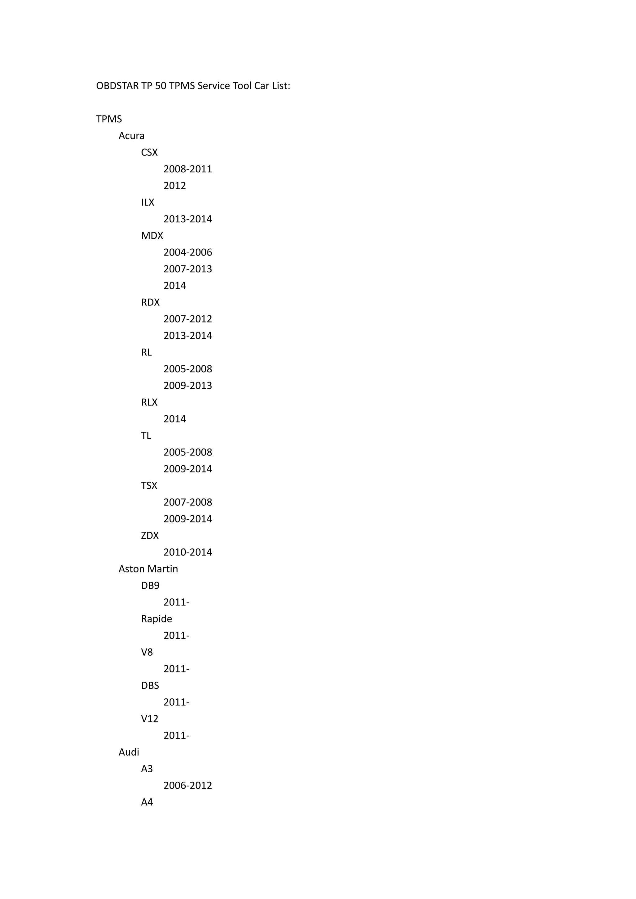 Le document présente la liste des véhicules compatibles avec l'outil de service TPMS OBDSTAR TP50. Il inclut des modèles d'Acura, Aston Martin, Audi, Bentley, BMW, Buick, Cadillac, Chevrolet, Chrysler, Citroën, Dodge, Ferrari, Fiat, Ford, GMC et bien d'autres, avec des précisions sur les années de fabrication. Cette liste est essentielle pour les professionnels de l'entretien automobile cherchant à utiliser cet outil sur les véhicules mentionnés.