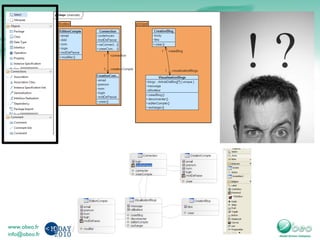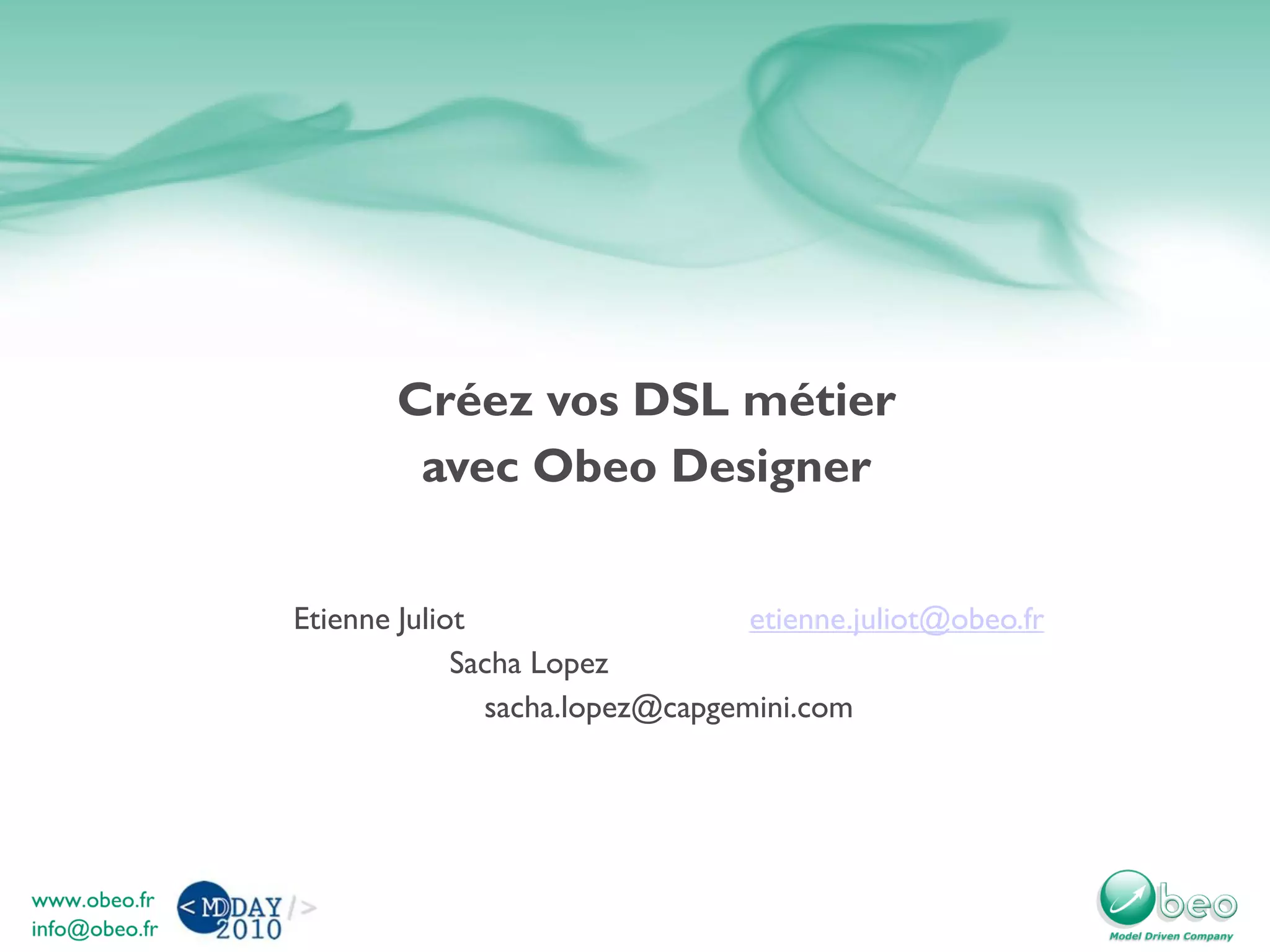Le document présente Obeo Designer, un outil permettant de créer des Domain Specific Languages (DSL) pour diverses applications professionnelles. Il décrit des notations variées, ainsi que des exemples pratiques d'utilisation à travers des règles métiers et des techniques de programmation. Le contenu inclut également des fonctionnalités liées à la traçabilité et à l'architecture d'entreprise.