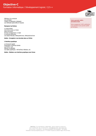 La formation objective-C proposée par Certyou, d'une durée de 5 jours, vise à enseigner aux développeurs à créer des applications complètes en utilisant ce langage. Le programme couvre divers sujets, notamment l'historique, l'environnement de développement, la syntaxe, la gestion de la mémoire, ainsi que le développement d'interfaces graphiques. Un coaching post-formation est également inclus pour assurer le soutien des participants dans la réalisation de leurs objectifs.
