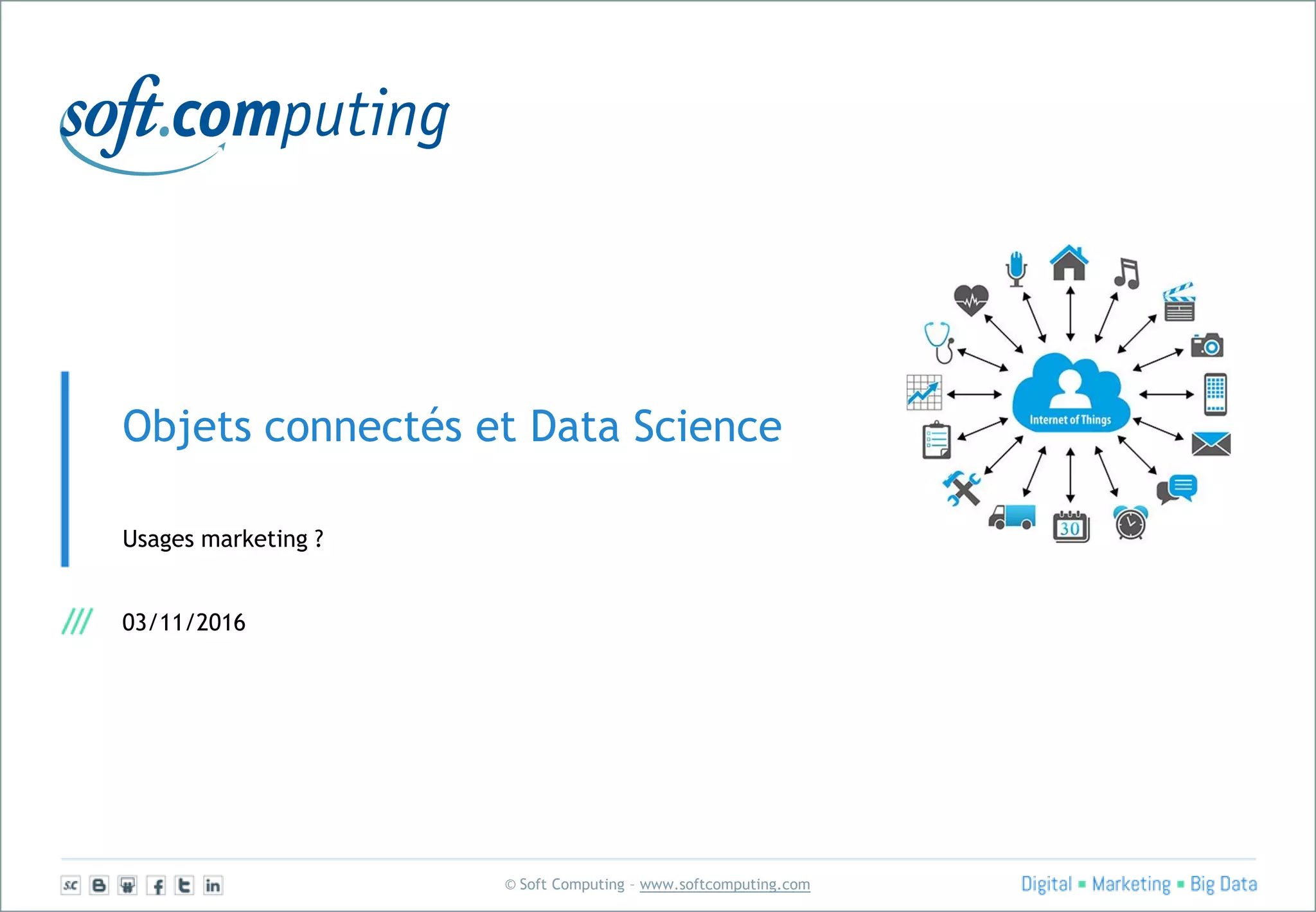 Ce séminaire aborde les opportunités offertes par les objets connectés et le big data dans le marketing, en mettant l'accent sur l'application de la data science pour analyser et utiliser efficacement les données générées. Il présente des techniques et des conseils pratiques pour transformer ces données en connaissances actionnables, ainsi que des exemples d'applications dans divers secteurs tels que la santé et la domotique. Soft Computing, organisateur de l'événement, est spécialisé dans le marketing digital orienté données et accompagne de nombreuses entreprises dans l'exploitation de ces technologies.