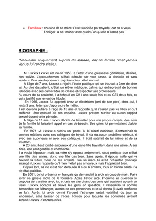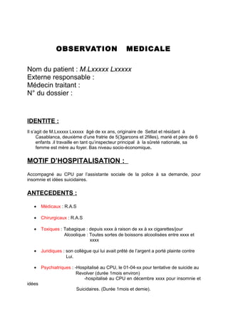 Le document décrit le cas de M. Lxxxxx, un homme de 54 ans, confronté à des problèmes de santé mentale, notamment des insomnies et des idées suicidaires, résultant d'une situation financière difficile et de plusieurs hospitalisations antérieures pour dépression. Son histoire personnelle montre des antécédents familiaux et sociaux compliqués, y compris un mariage arrangé et des tentatives de suicide. Malgré le traitement en cours, il reste pessimiste face à sa situation financière, mais montre des signes d'amélioration concernant ses symptômes dépressifs.