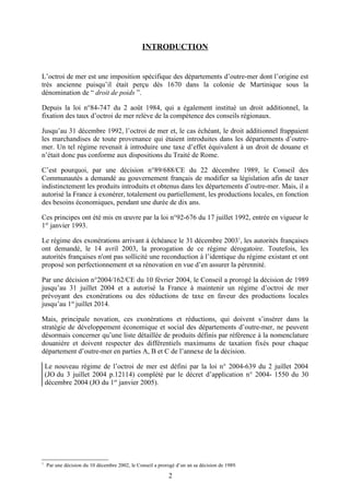 Le document traite du régime fiscal de l'octroi de mer dans les départements d'outre-mer, établi par la loi n° 2004-639. Il présente les exonérations et ajustements de taxation appliqués aux produits locaux ainsi que les principes de gestion et de contrôle par les douanes. Des mesures visant à améliorer le développement économique local et à simplifier les démarches fiscales pour les producteurs sont également abordées.