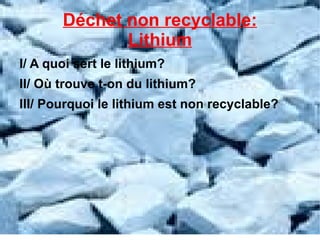 Le lithium est principalement utilisé comme anode dans les batteries en raison de son potentiel électrochimique élevé. On le trouve dans plusieurs pays, avec la plus grande réserve située en Amérique du Sud. Il est non recyclable car il est nocif pour l'environnement et la santé humaine.