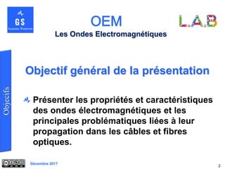 La présentation traite des propriétés et caractéristiques des ondes électromagnétiques, ainsi que des problématiques de leur propagation dans les câbles et fibres optiques. Elle couvre des concepts tels que la dualité onde-corpuscule, le spectre électromagnétique, ainsi que les techniques de transmission et d'adaptation de l'impédance. Enfin, elle évoque les avantages des liaisons optiques en termes de débit d'information et d'immunité au bruit.