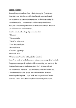 Le document propose des prêts d'argent entre particuliers pour aider ceux qui rencontrent des difficultés financières, notamment des personnes fichées ou ayant un mauvais dossier de crédit. Il met en avant divers types de prêts disponibles, tels que les prêts immobiliers, personnels et pour la consolidation de dettes. Les intéressés sont encouragés à contacter l'auteur pour discuter des conditions de financement.