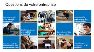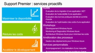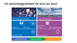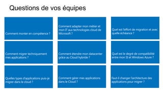 Le document présente un ensemble de services et d'ateliers destinés à faciliter la migration vers le cloud, en se concentrant sur la gestion des ressources, l'optimisation des coûts et l'évaluation des applications. Il propose une méthodologie en plusieurs étapes pour implanter une stratégie cloud, allant de l'analyse des coûts à la définition d'une architecture cible. En outre, il mentionne un support dédié pour Windows Azure afin d'assurer la gestion des incidents et de rationaliser l'infrastructure.