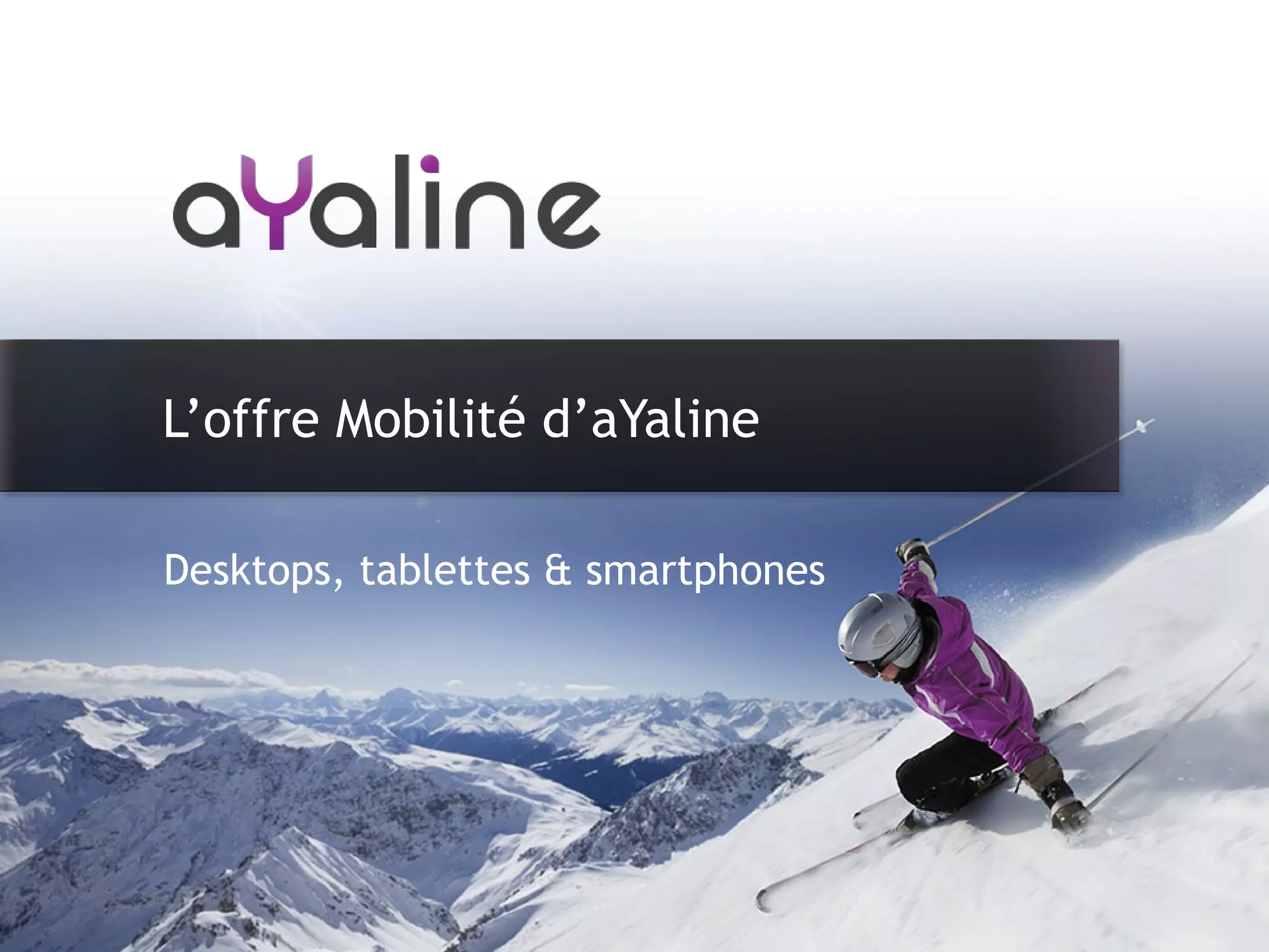 Le document présente l'offre de mobilité d'Ayaline, soulignant l'importance croissante des smartphones et tablettes pour les achats en ligne, avec une augmentation des ventes de tablettes par rapport aux PC. Il met en avant la nécessité d'adapter les sites web et les e-mails aux multiples dimensions d'écran pour améliorer l'expérience utilisateur et la conversion. Ayaline propose des solutions variées, incluant des sites web responsives et des applications mobiles, tout en garantissant une approche intégrée et open source.