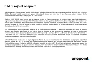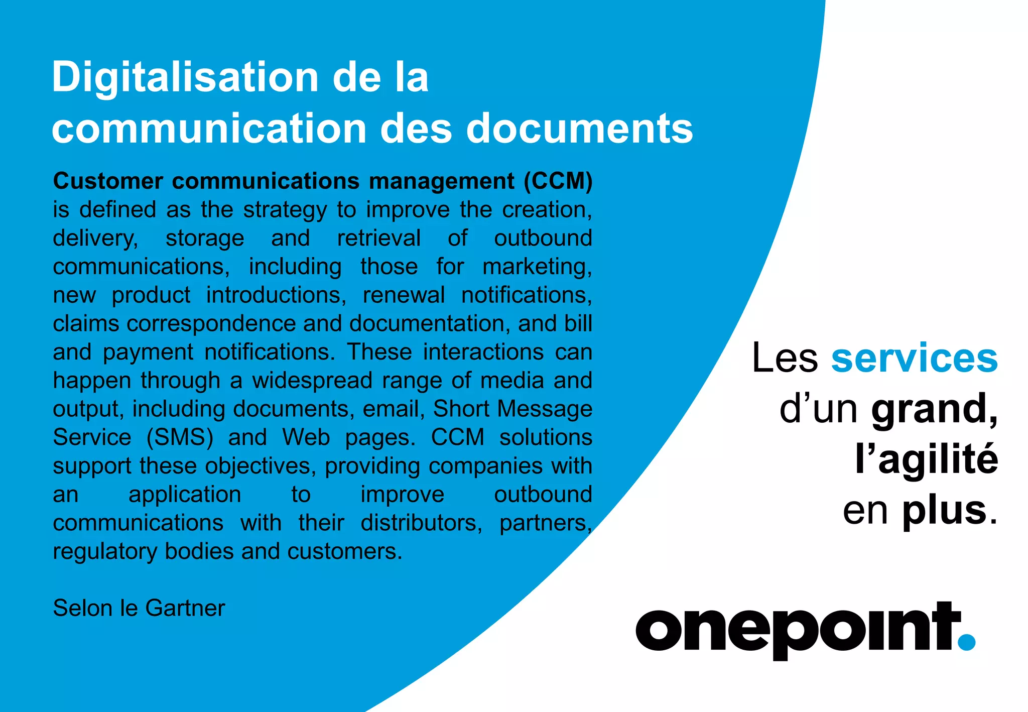 La communication client est essentielle pour la transformation numérique, soulignant l'importance d'améliorer la gestion des communications à travers divers médias. Onepoint, récemment renforcé par l'acquisition d'e.m.s., offre des solutions agiles en Customer Communications Management, visant à optimiser l'expérience client dans les secteurs public et privé. Cette synergie permet à Onepoint d'élargir son expertise tout en maintenant des standards de qualité élevés dans ses services.