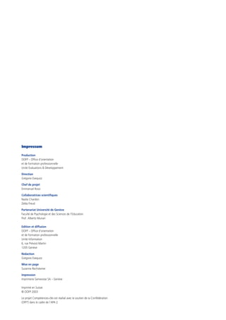 Le document présente le projet 'compétences-clés', un dispositif d'évaluation et de reconnaissance officielle des compétences transversales, développé par l'Office d'orientation et de formation professionnelle de Genève. Il détaille les étapes de construction du dispositif, les méthodes utilisées, ainsi que les résultats d'une recherche-action menée sur deux ans, tout en soulignant la complexité et les défis liés à la définition de ces compétences. Ce projet vise à améliorer l'employabilité en offrant un cadre théorique et pratique pour l'évaluation et la reconnaissance des compétences-clés dans le marché du travail actuel.