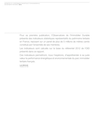 Le baromètre 2012 de l'Observatoire de l'immobilier durable présente des indicateurs sur la performance énergétique et environnementale de plus de 5 millions de mètres carrés de bâtiments tertiaires en France. Ces données, issues d'une base de membres variés, visent à optimiser les investissements en rénovation énergétique et à établir des benchmarks pour la performance des bâtiments. Les résultats soulignent l'importance de la gestion énergétique et offrent un cadre pour mesurer l'impact des actions d'amélioration.