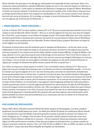 Olivier Dewolf, spécialiste de la colombophilie sur la ligne du Rhône, a obtenu de bons résultats lors de la première course nationale de la saison à Valence, avec plusieurs pigeons classés. Il fait preuve d'humilité malgré son palmarès impressionnant, privilégiant la préservation et la sélection rigoureuse de ses pigeons pour les concours. Dewolf collabore également avec Michel de Smael, chacun se spécialisant dans différentes phases de la compétition, témoignant de leur expertise dans la longévité et la performance des pigeons.