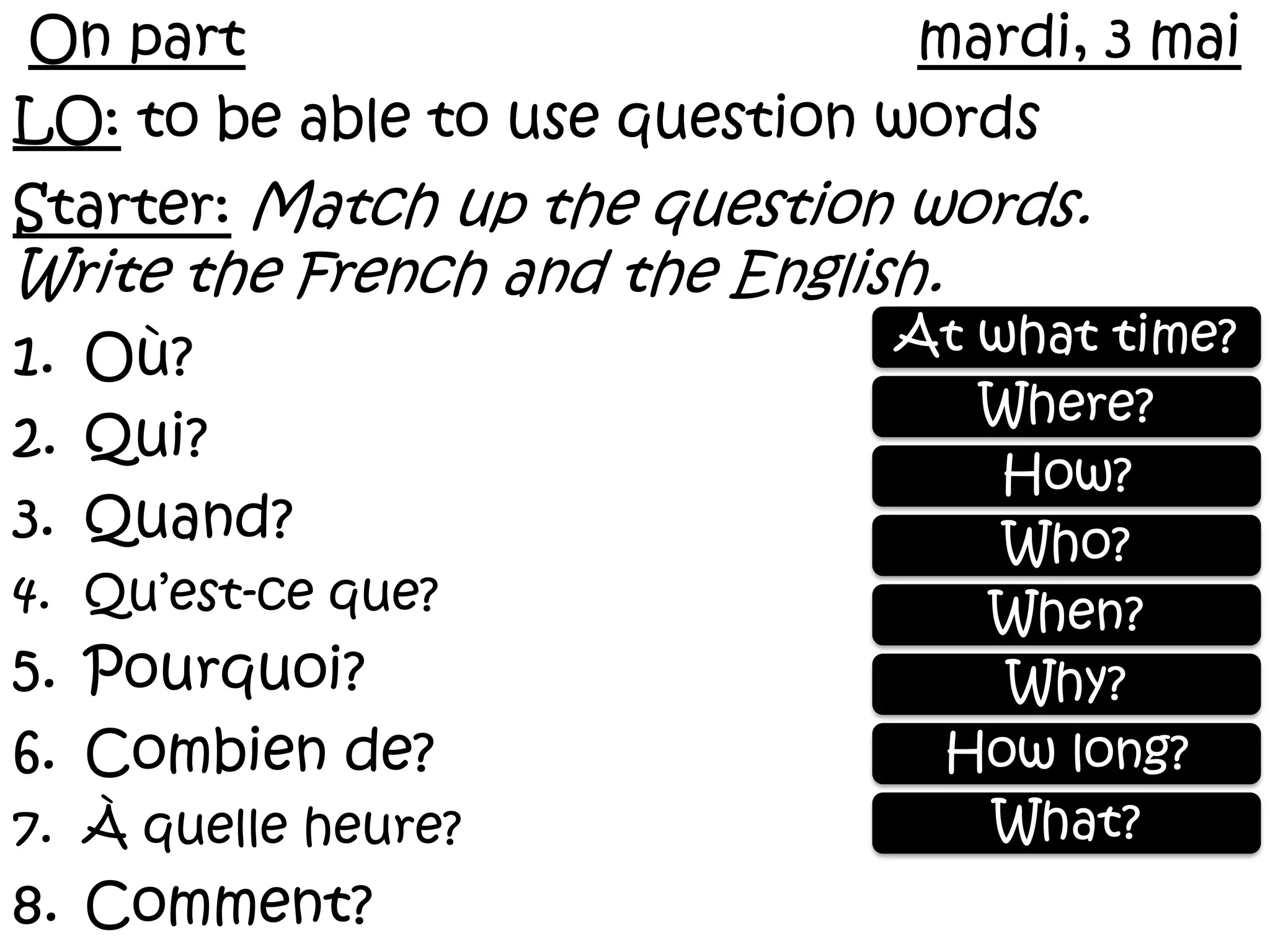 Le document traite des mots interrogatifs en français et anglais ainsi que des questions liées aux vacances. Il présente une série de questions et réponses sur les préférences de vacances, la durée des séjours et les activités effectuées. Des verbes et expressions sont utilisés pour décrire les expériences passées en matière de voyage.