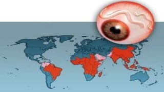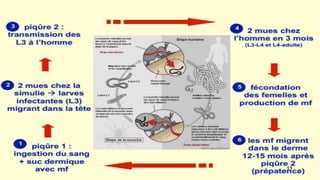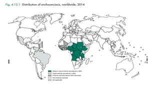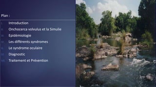 L'onchocercose est une maladie parasitaire causée par Onchocerca volvulus, transmise par des mouches du genre Simulium, et représente la quatrième cause de cécité évitable dans le monde. Cette maladie entraîne divers syndromes, principalement cutanés et oculaires, affectant des millions de personnes, notamment en Afrique. Le diagnostic repose sur la détection des microfilaires et le traitement se fait principalement par l'ivermectine, avec une prévention axée sur l'élimination des vecteurs.