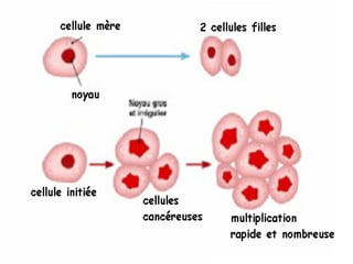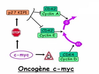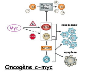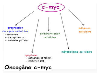 Le document aborde les concepts fondamentaux des oncogènes et de l'oncogenèse, ainsi que leur relation avec le cancer, un problème de santé publique majeur. Il traite des mécanismes cellulaires de la croissance et de la mort cellulaire, les types d'oncogènes, les facteurs de risque et les applications thérapeutiques. La conclusion souligne que le cancer est une maladie résultant de mutations génétiques et met en avant l'importance des thérapies ciblées.